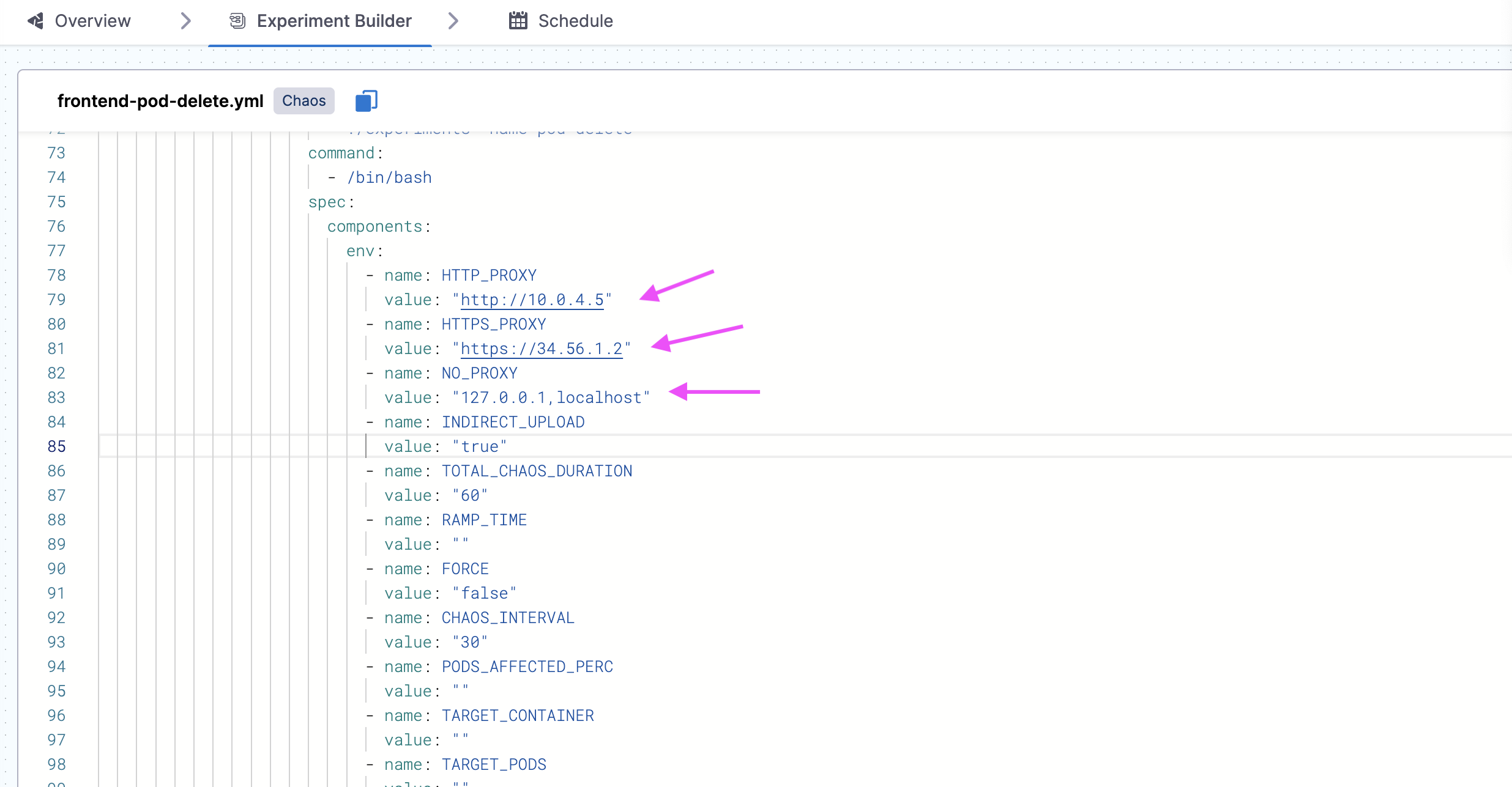 NO_PROXYis set with the cluster IP of the cluster where you deploy the chaos infrastructure. This allows requests to be directed to the Kube API server directly instead of going through a proxy. In addition, the proxy may not be able to connect to the Kube API server if it is deployed outside the cluster.