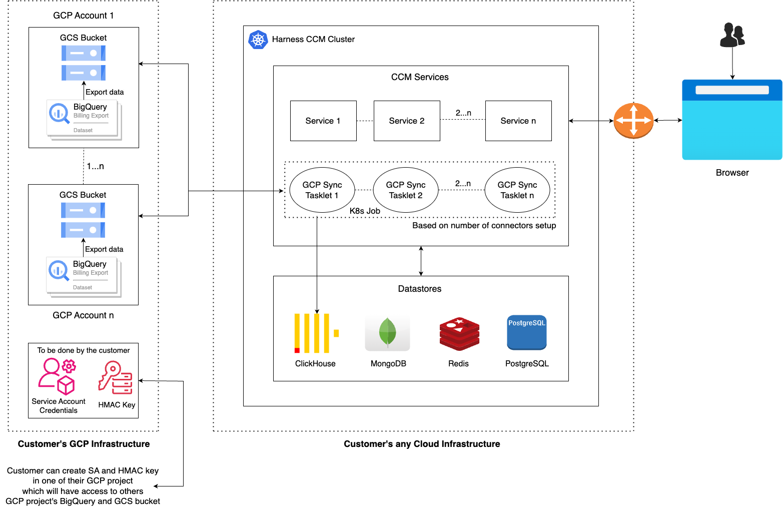 - K8s Job: In the cloud-hosted infra, a K8s Job is configured to run daily. This job performs all necessary steps to ingest GCP billing data from BigQuery to ClickHouse, utilizing a GCS bucket as an intermediary and then eventually to ClickHouse table.
