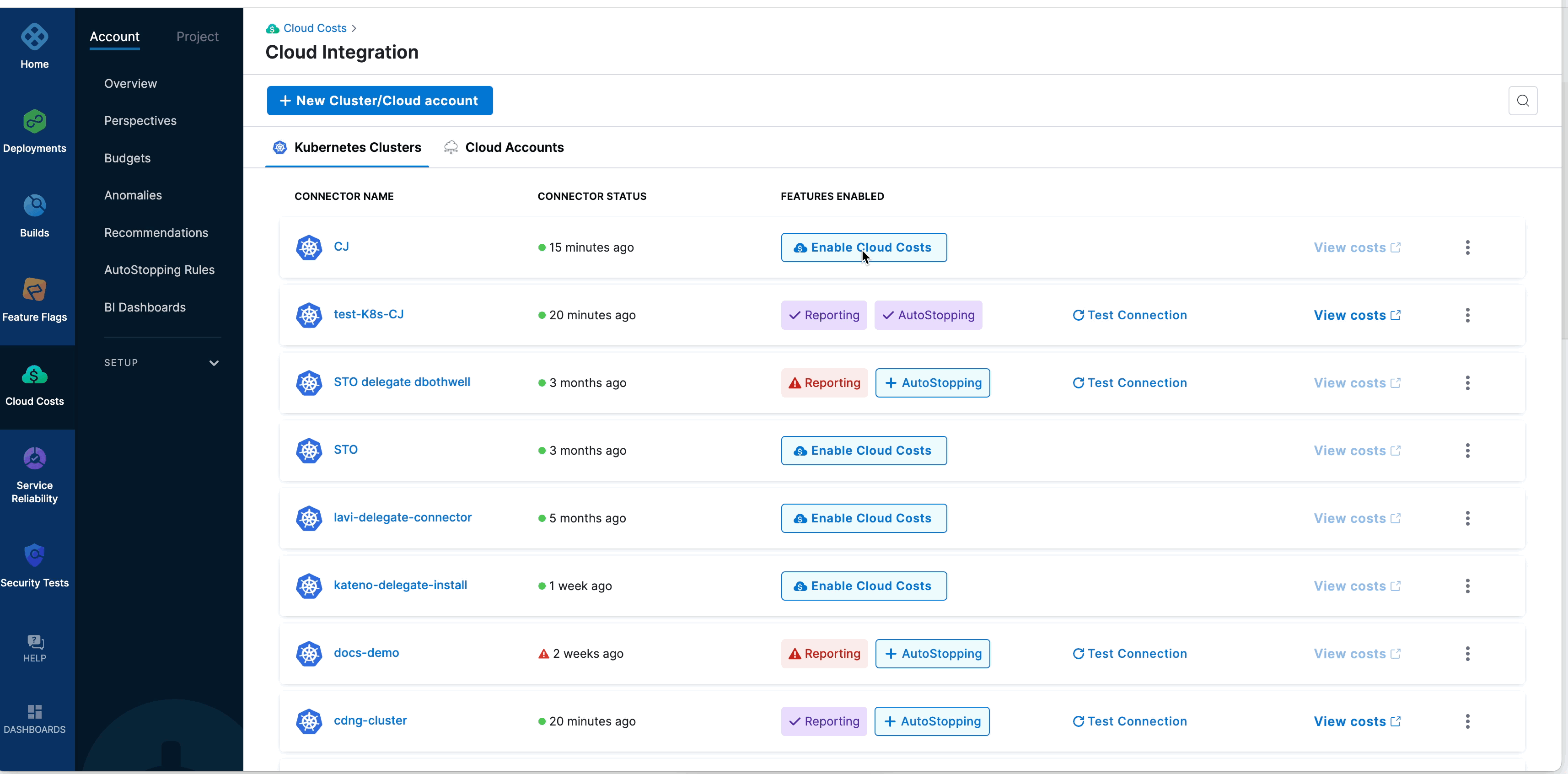 The Cloud Integration page displays the existing connectors for the Kubernetes clusters and the cloud accounts. - To enable cloud costs for a Kubernetes cluster, select Enable Cloud Costs for the Kubernetes Connector.
