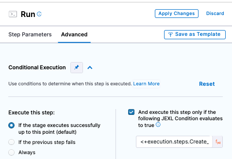 • Configure a conditional execution only if 'Find Existing Autostopping Rule' doesn't find a rule: <+steps.Find_Existing_AutoStopping_Rule.output.outputVariables.RULE_ID> == ""