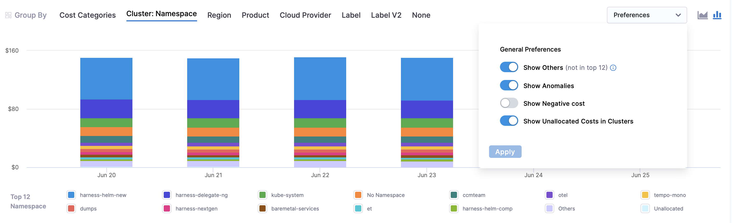 | Namespace | Cost of each Kubernetes namespace in the cluster (not applicable to ECS clusters) |