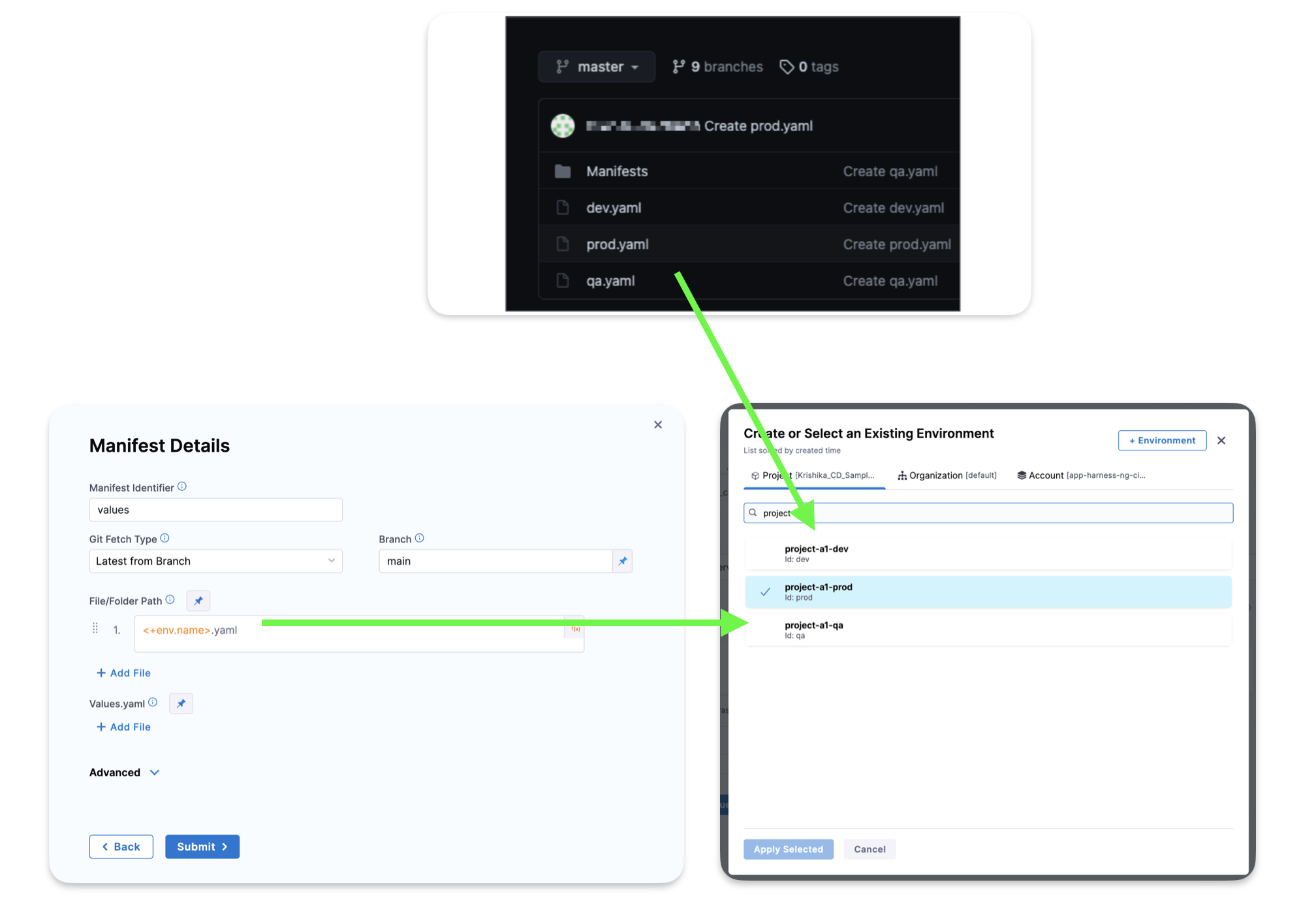 Next, in the Environment setting, you add three Environments, one for each YAML file name.