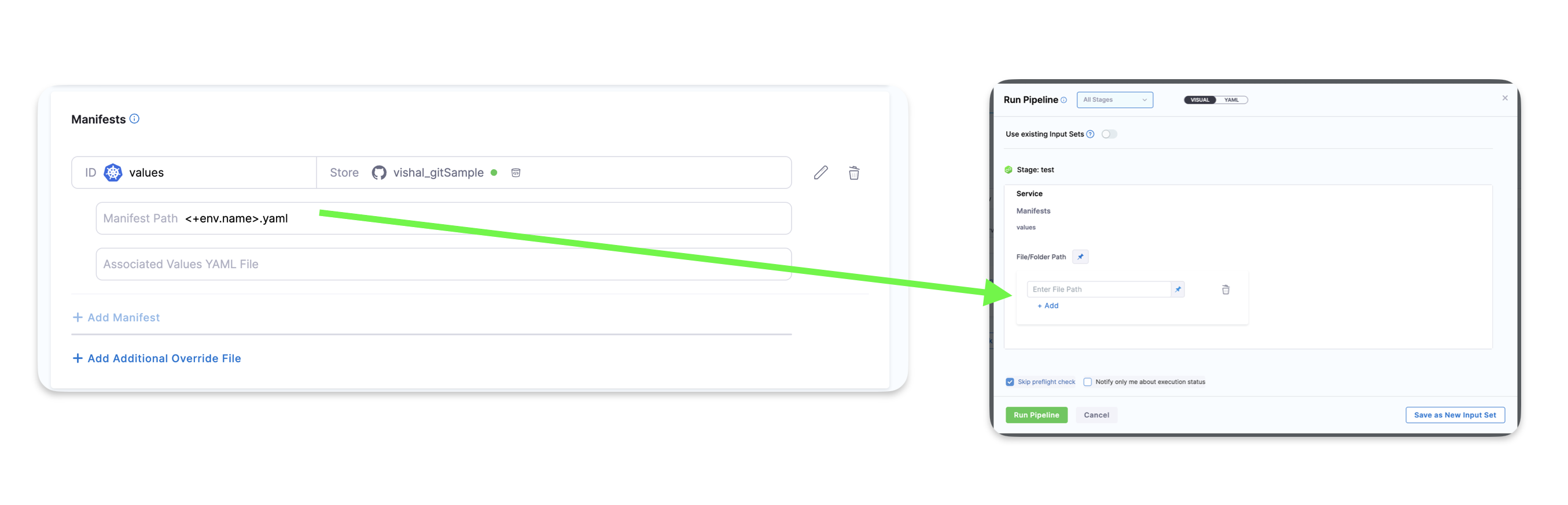 In Manifest Details for the values file, in File Path, select Runtime Input. At runtime, you simply enter the name of the values file to use.