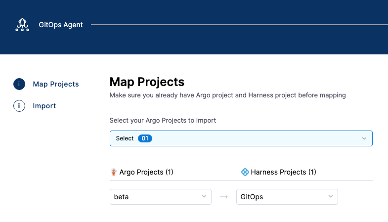 4. In Map Projects, in Select your Argo Projects to Import, select an Argo CD project. Do not select a project you have already mapped.