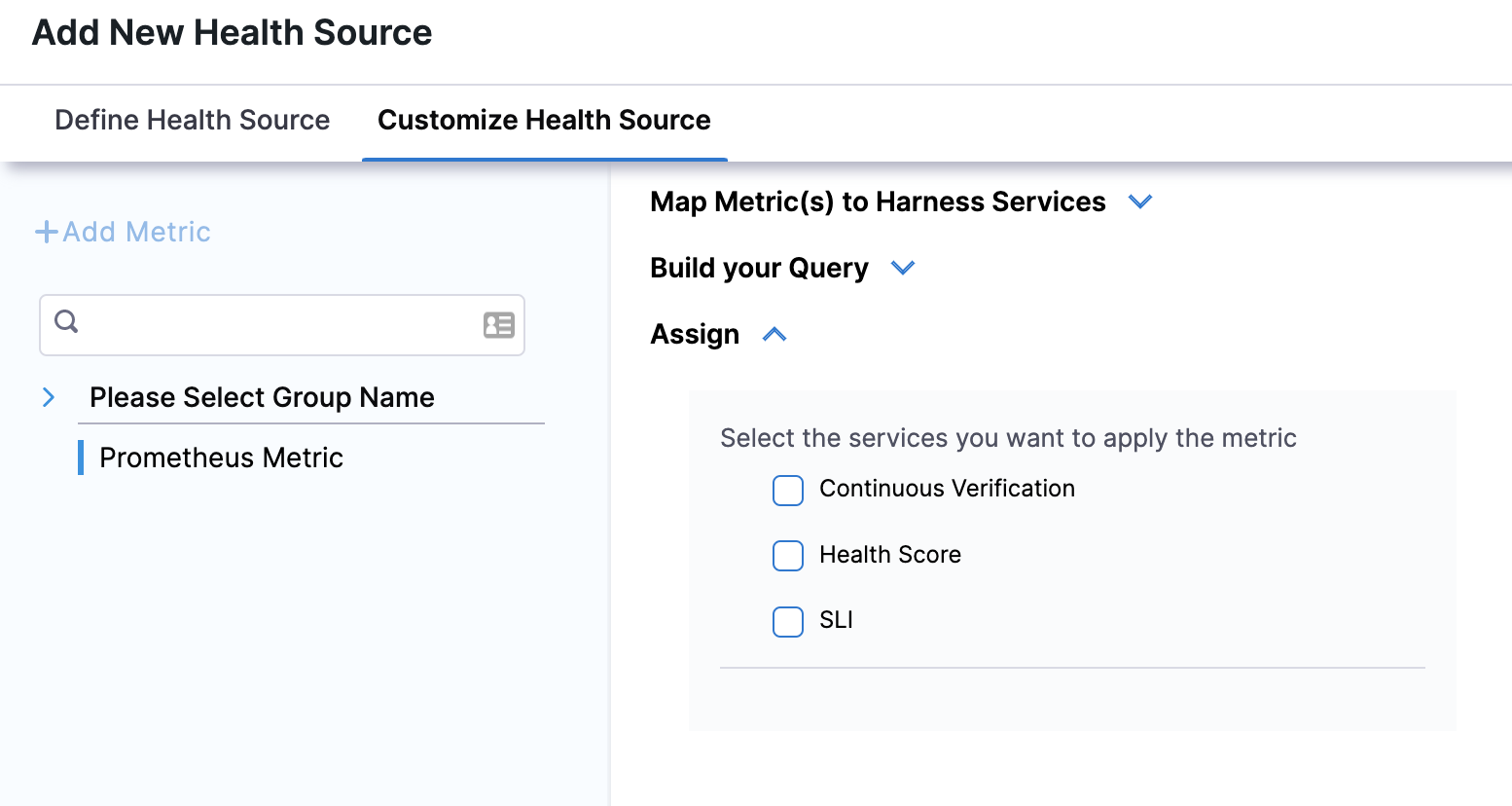 In Assign, you can select the services for which you want to apply the metric.