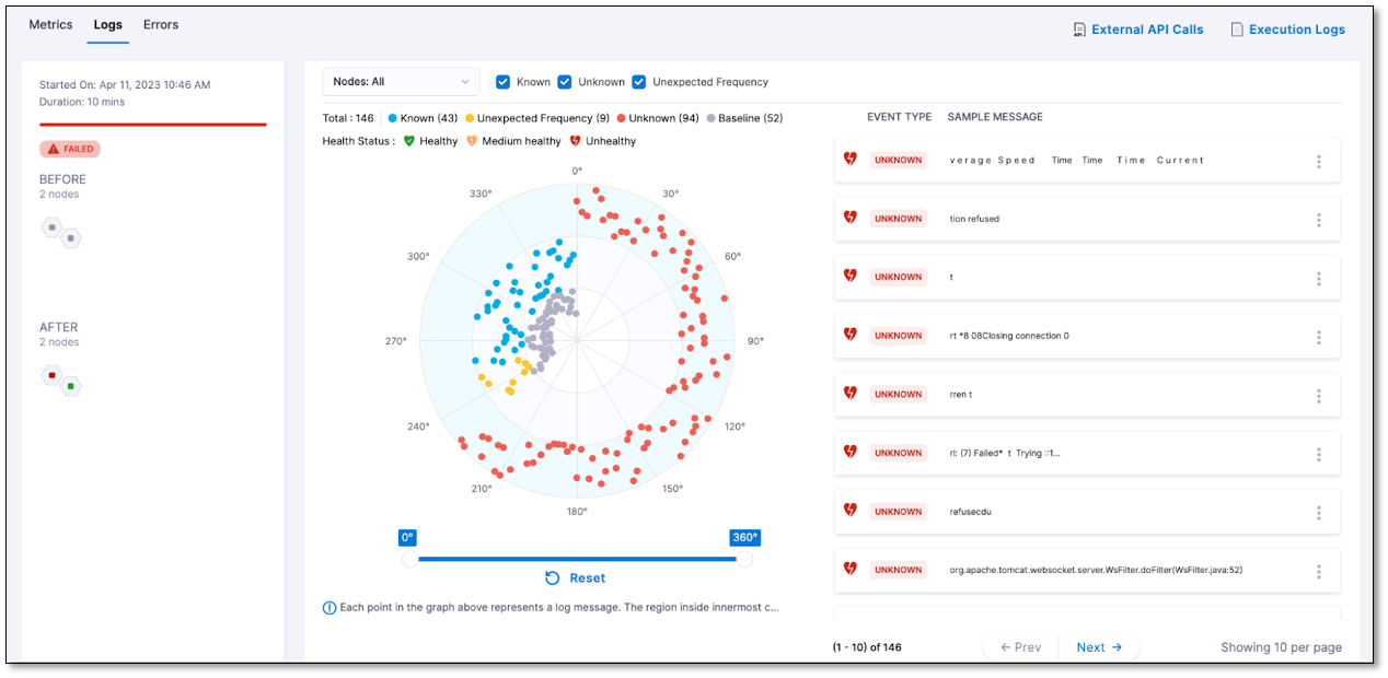 Sample message: Hover over a cluster to view a sample message associated with that cluster. When you hover over Known and Unexpected frequency clusters, the innermost circle highlights the cluster seen on the Primary or Before nodes.