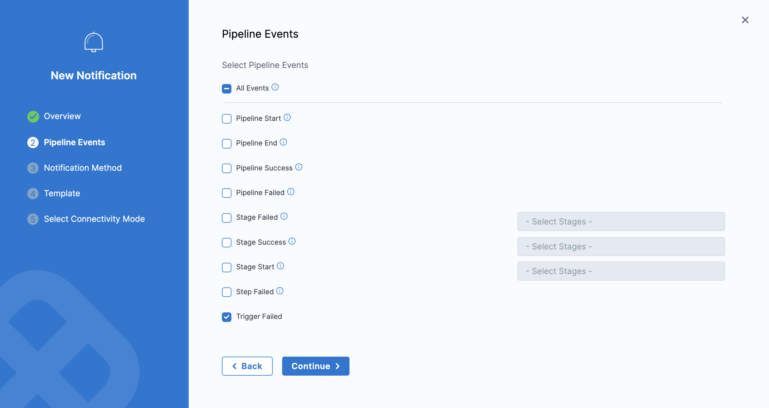 You can select events for the pipeline or stages.