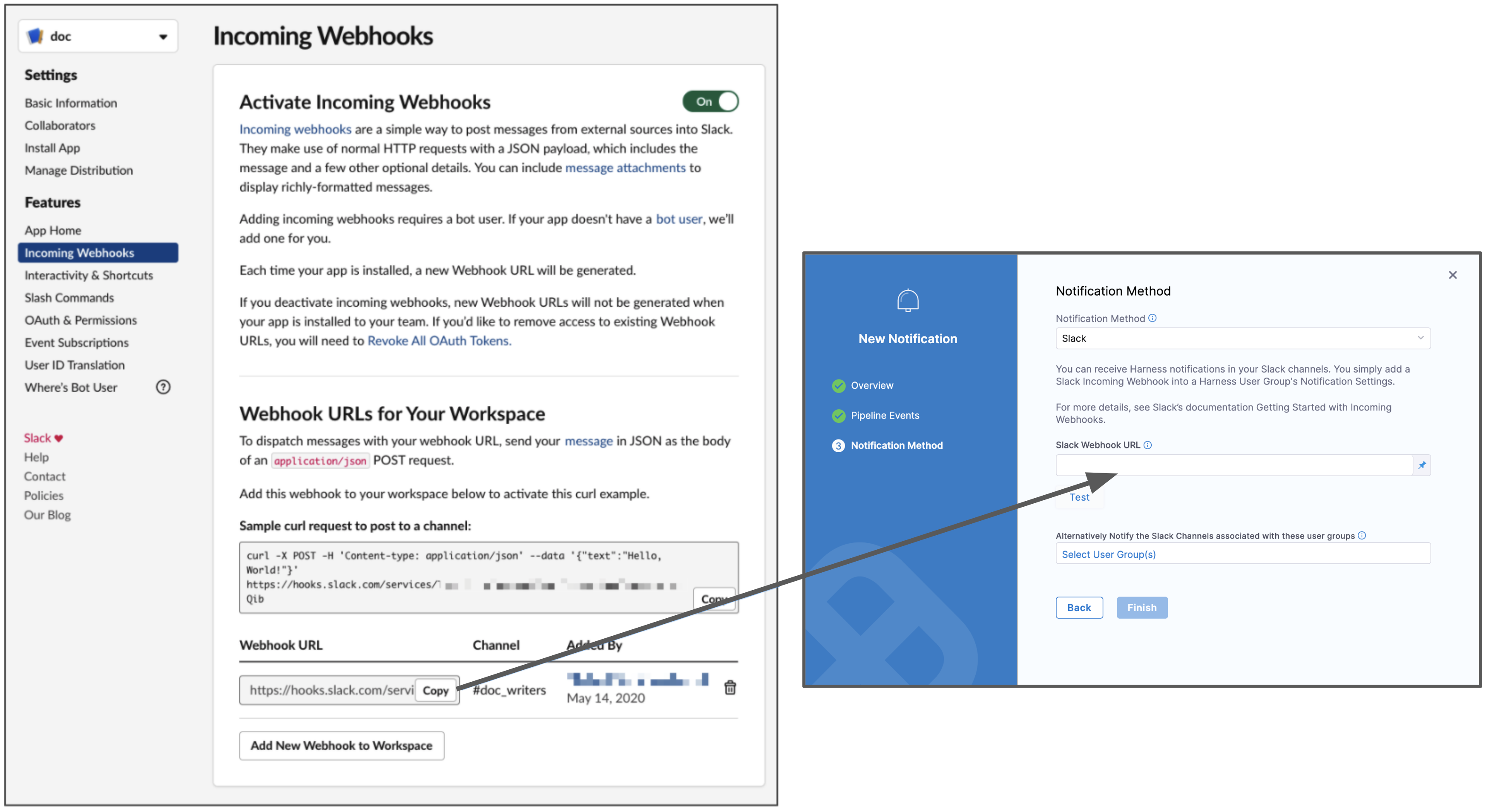 Follow the steps in Slack documentation for creating a Slack app, selecting your channel, and creating a webhook: sending messages using incoming webhooks.
