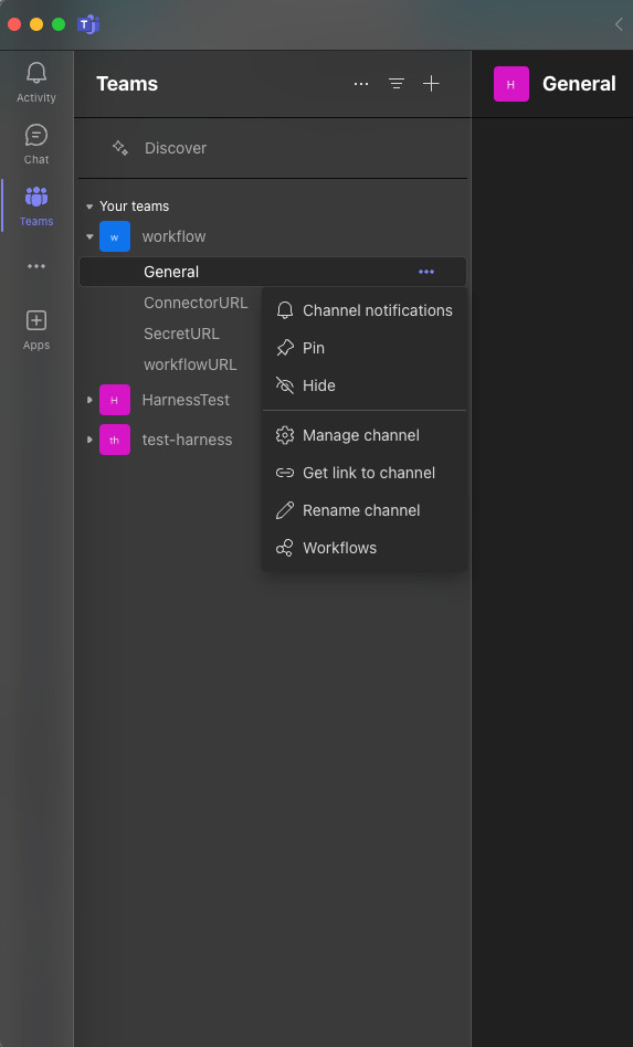 1. In Microsoft Teams, right-click the channel name where you want to send notifications, and select Workflows from the menu.