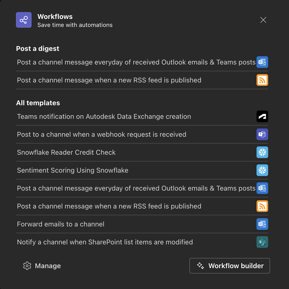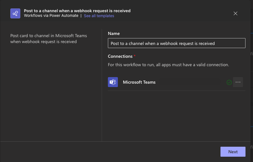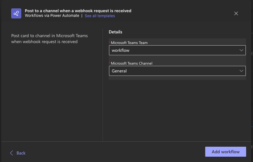 1. Select the Team and Channel where you’d like to receive notifications, then click Add Workflow.