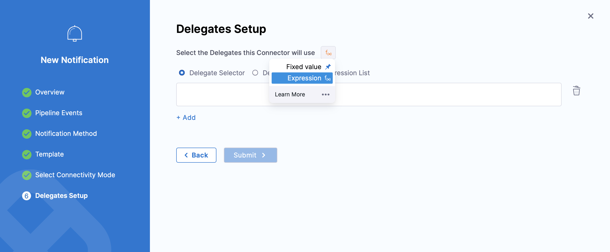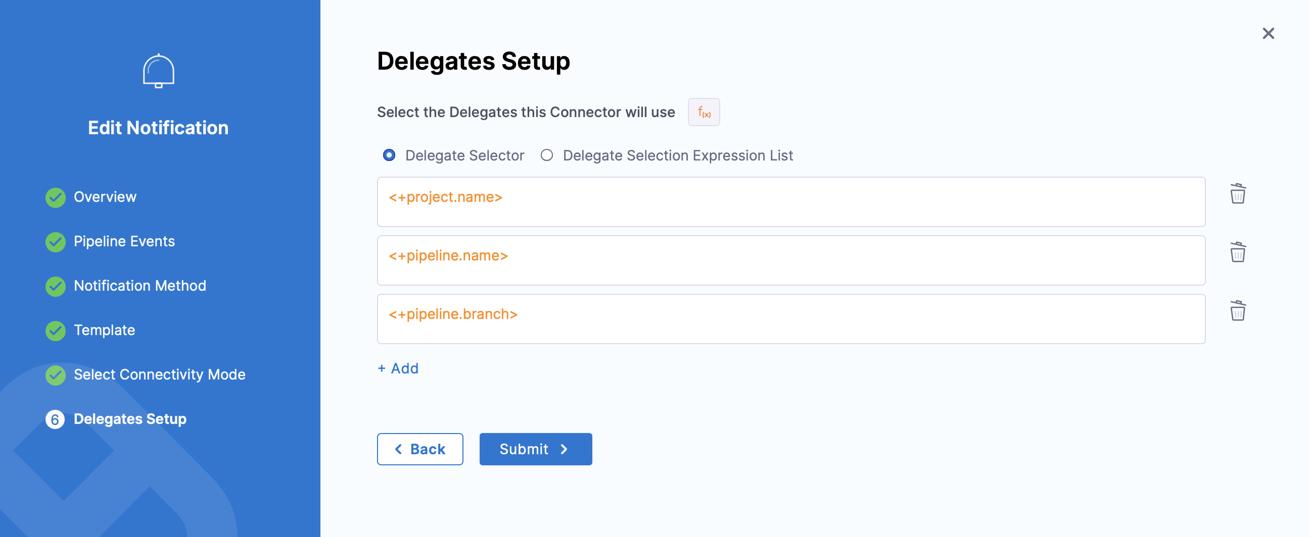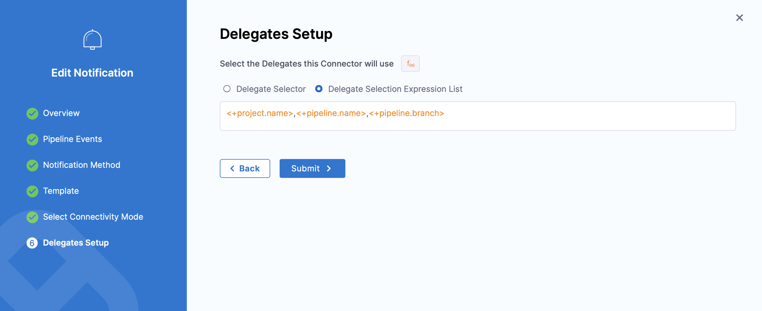 When you select Connect through Harness Delegate, and click on Continue, you will be asked to select the Delegate that this pipeline notification rule will use, in Delegate Setup.