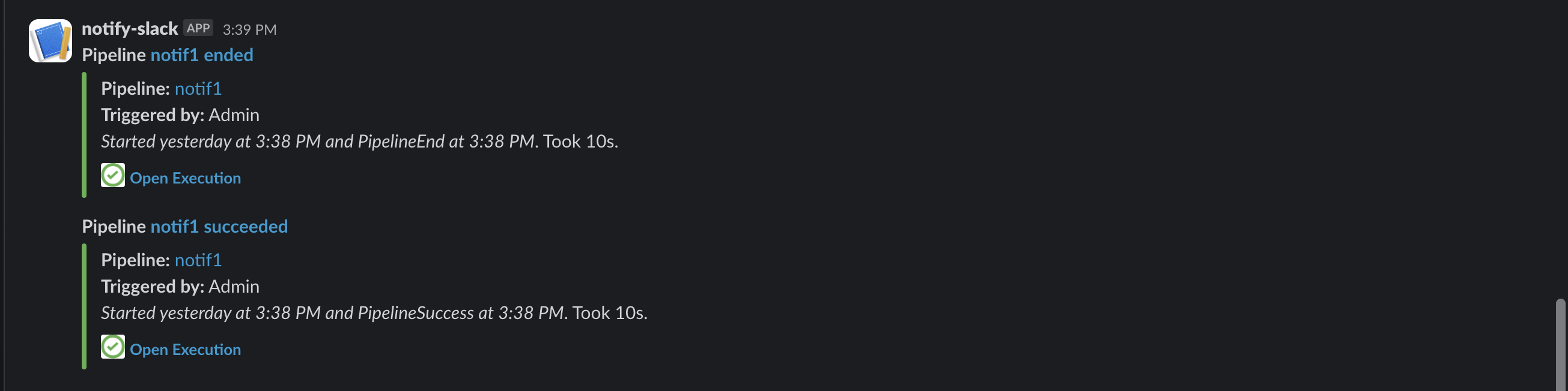For example, a Slack notification when the pipeline completes as well as when it is successful looks something like this: