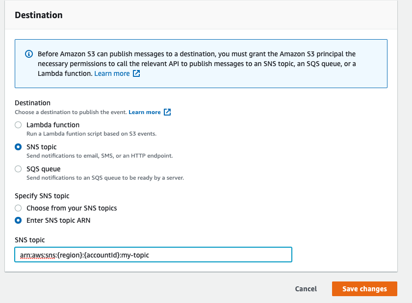 7. Under Destination > Destination, select SNS topic. Under Specify SNS topic, select Choose from your SNS topics. Find your SNS topic created in the previous section.