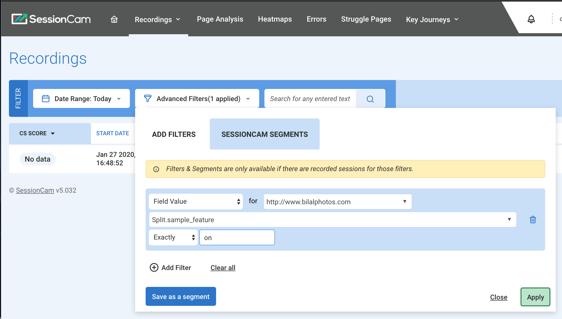 3. Select which feature flag you like to filter. You can enter split. and SessionCam displays the available stored variable names.