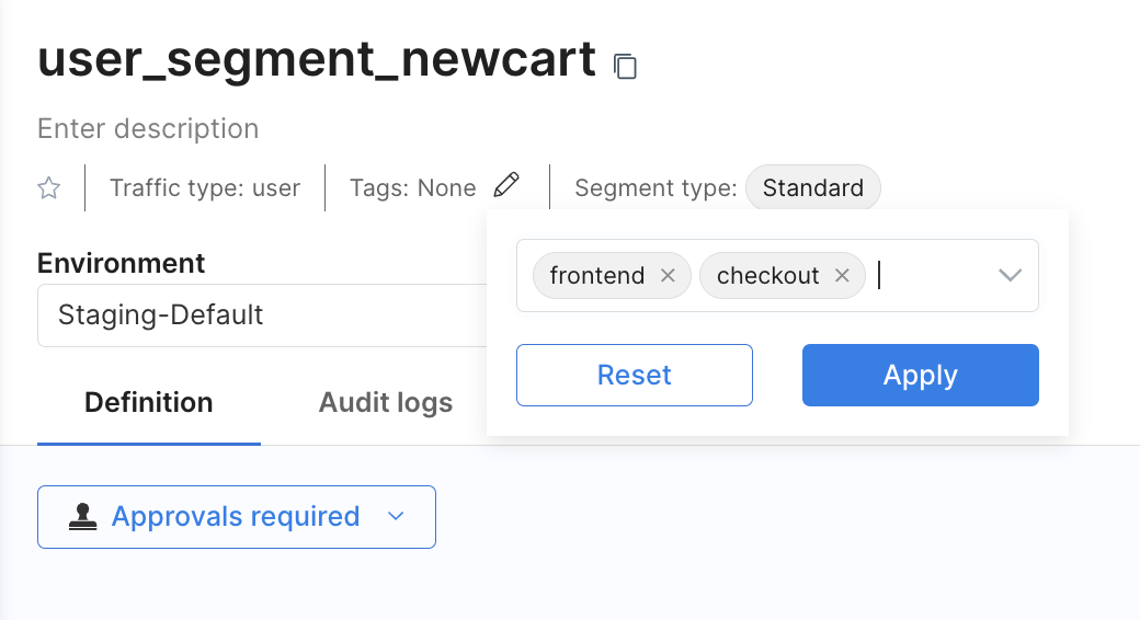 Use tags to narrow feature flags, segments, metrics, or experiments to only the objects that match one or more tags.