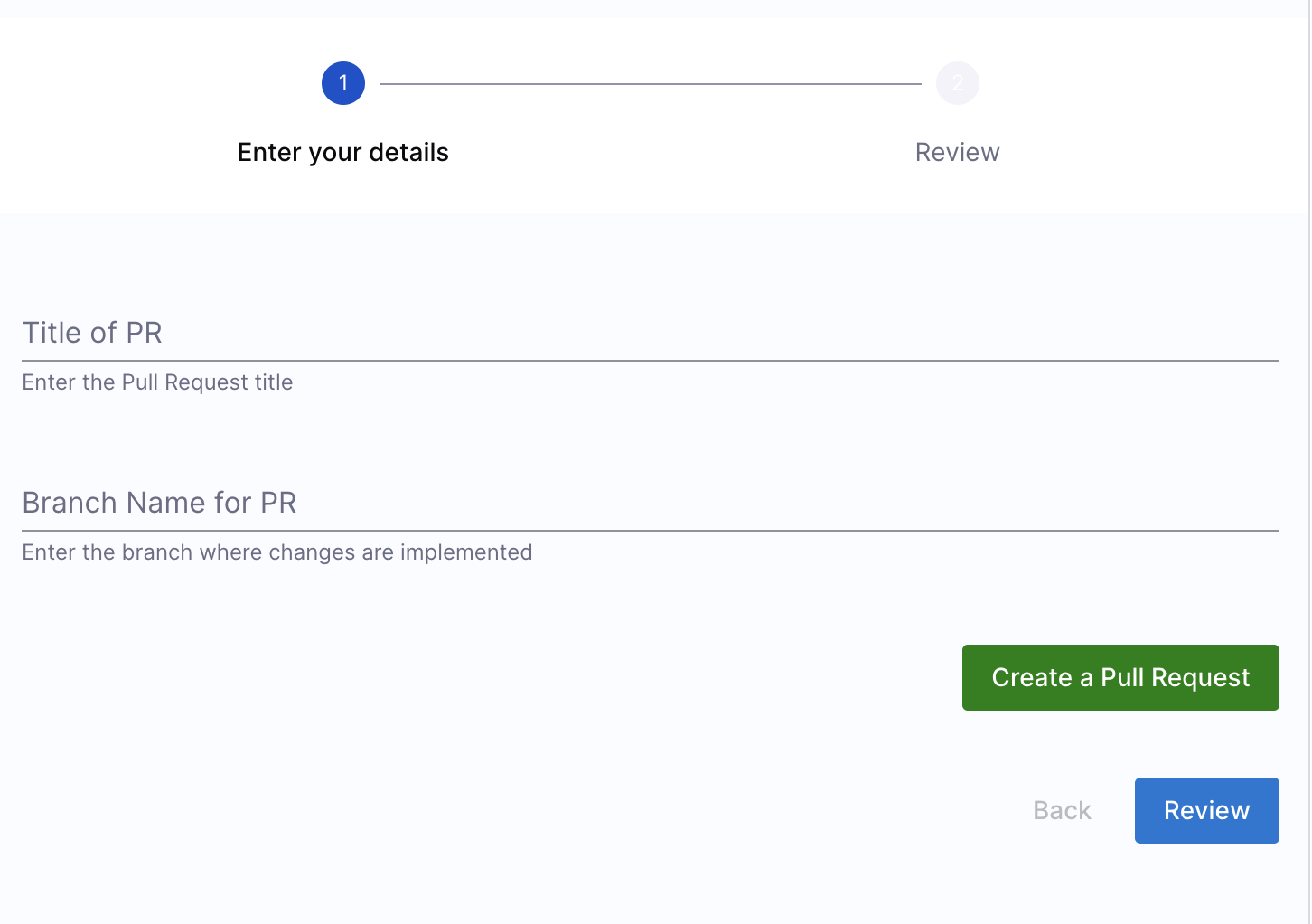 To finalize the workflow, we need a validation button that allows users to verify auto-fetched details and create a pull request.