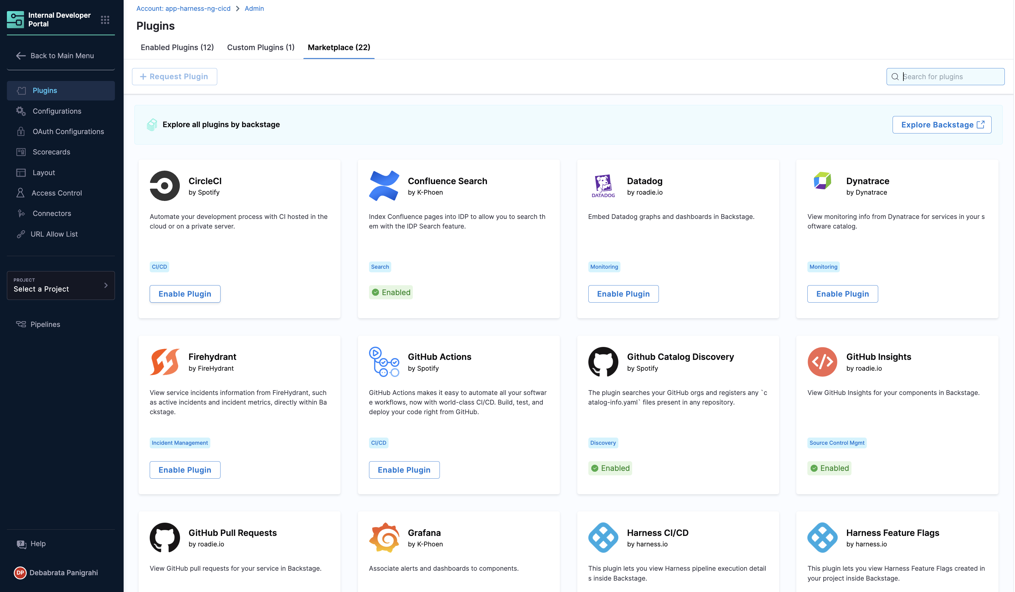 - Log in to Harness, and then select Developer Portal > Admin > Plugins. All administrative configurations, such as plugins, layouts, connectors, configurations, and access control are provided on the Admin page, and require the users to have the Harness Account Admin role or the IDP Admin role. The Plugins page showcases a collection of curated plugins categorized as enabled and disabled plugins.