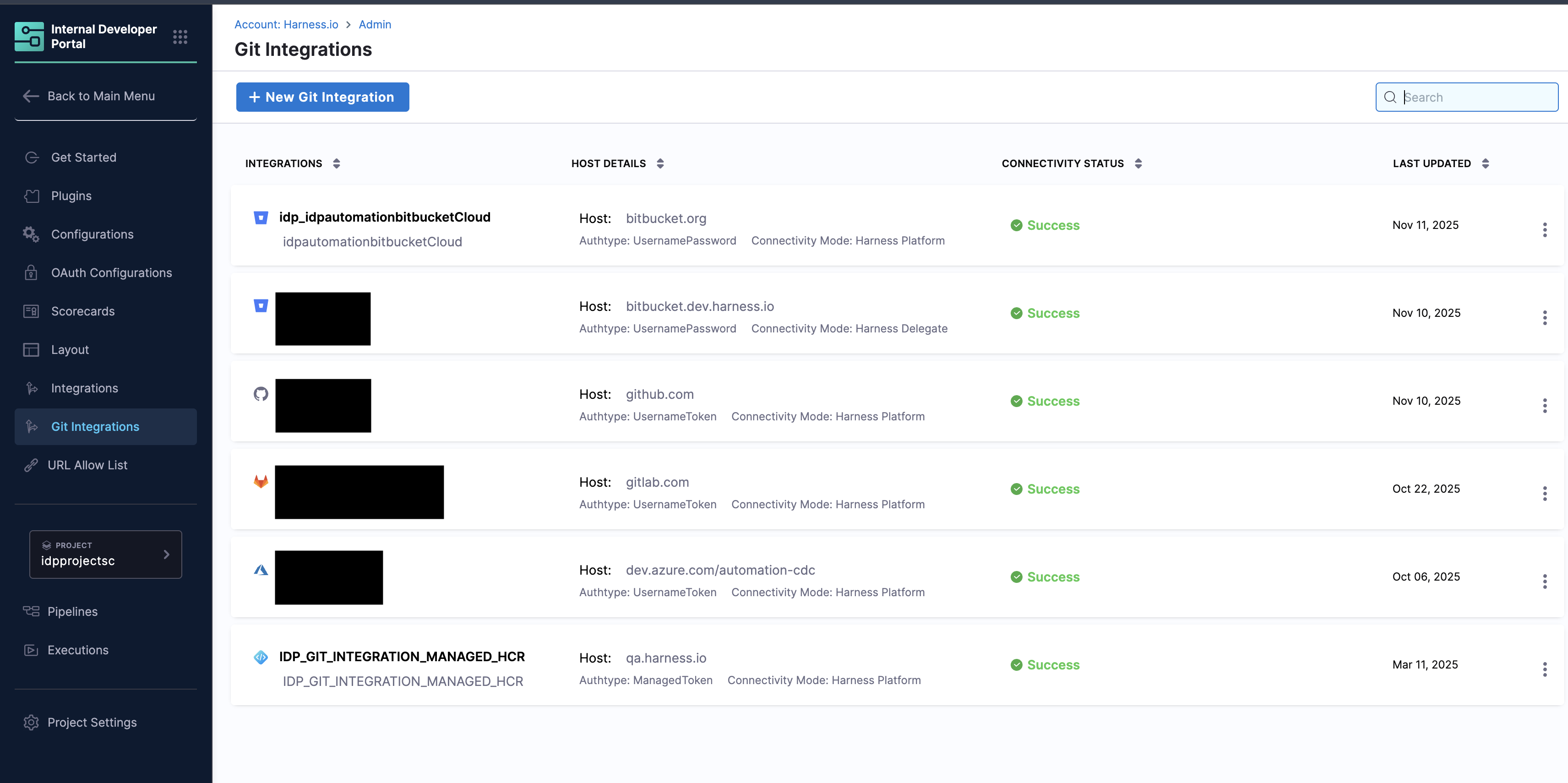 • Before starting, ensure you have access to your Git provider through Git Integrations in the IDP admin section with API access enabled. Follow the connector creation steps to set up your connector.