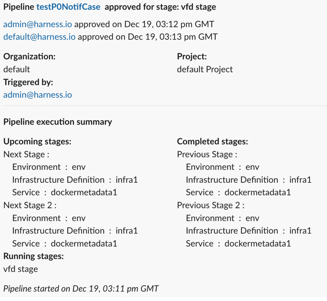 1. Approved or Rejected: A notification is sent when the approval step is approved or rejected. The notification contains the pipeline name, execution URL, step status, stage name, the user who triggered the pipeline, organization, and project details, pipeline start time, approval activity details containing approver name, action, and the time of the approval or rejection.