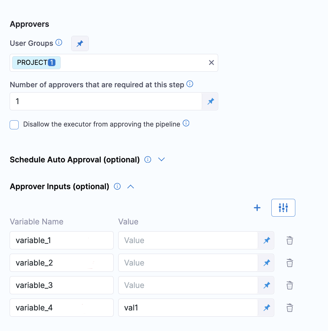 For example, if there were three approvers, and you added a Shell Script step that referenced the input variables with an expression, the expression would render the variable values entered by the final, third approver.