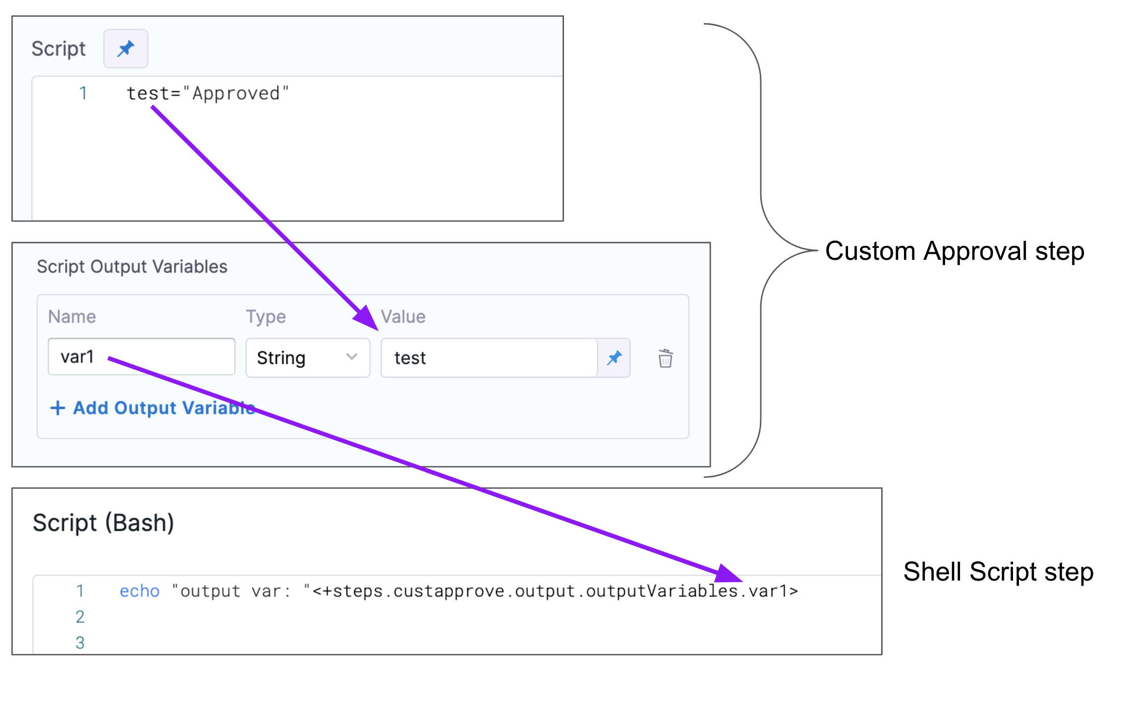 echo "output var: "<+steps.custapprove.output.outputVariables.var1>