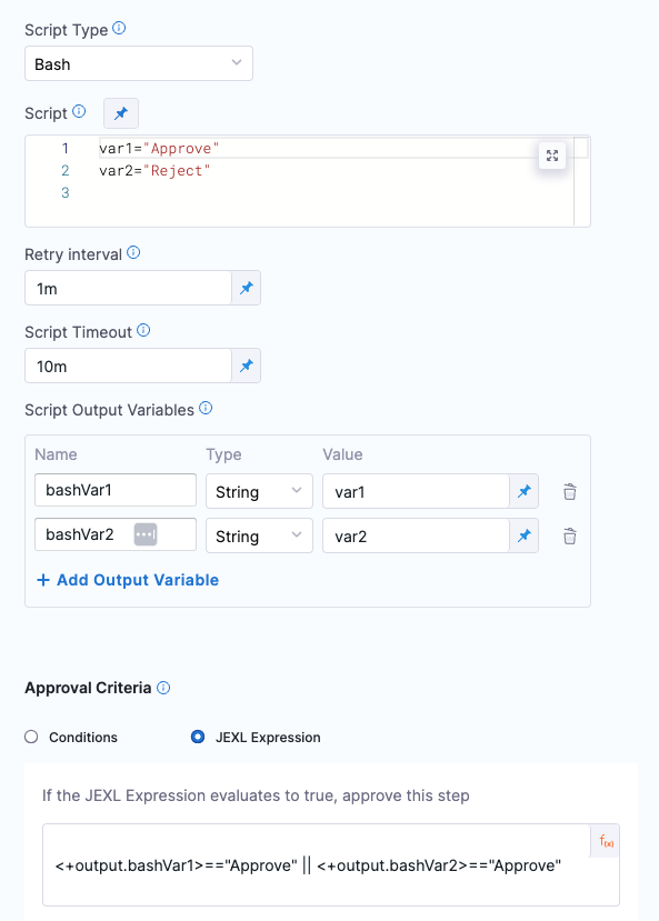 You can also use expressions in Value. For example, if you have an Output Variable from a previous Custom Approval or Shell Script step, you can copy it from the executed step Outputs.