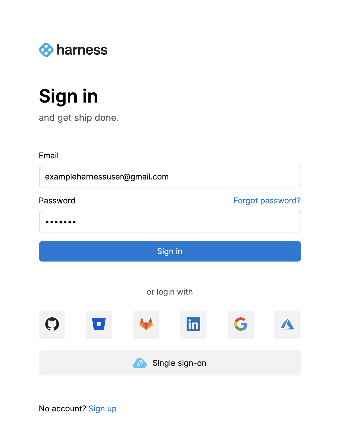 For all future logins, if you are already logged into your OAuth 2.0 provider in the same browser as Harness, simply enter your email address in Harness and log in automatically.