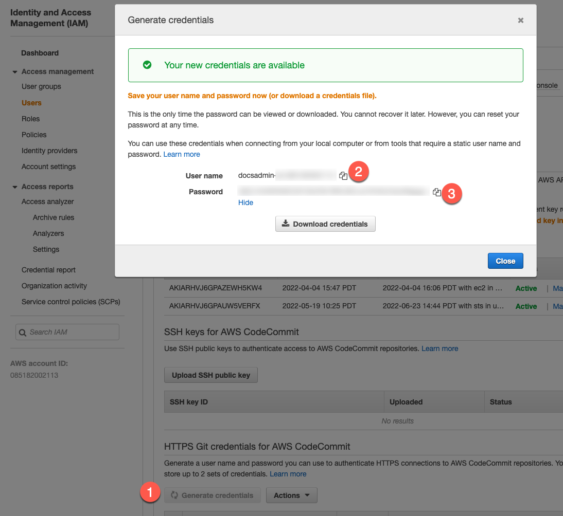 On the configuration page for the IAM User, select Security credentials, and then generate credentials in HTTPS Git credentials for AWS CodeCommit.