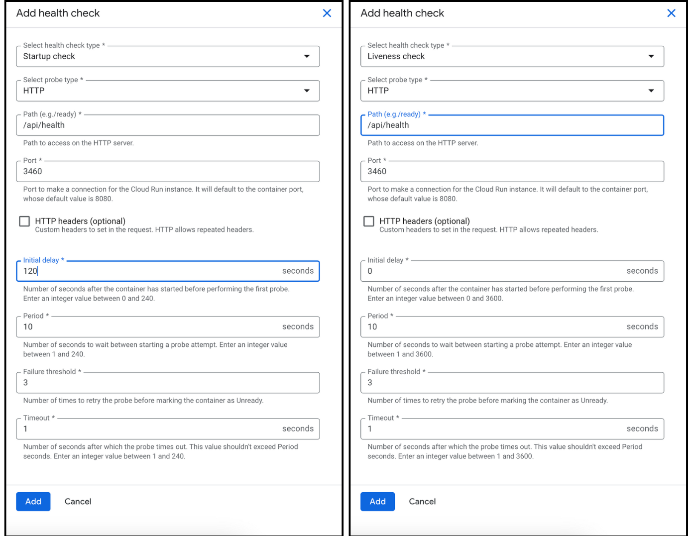 Click Add Health Checks, then configure the Startup Probe and Liveness Probe as follows:
