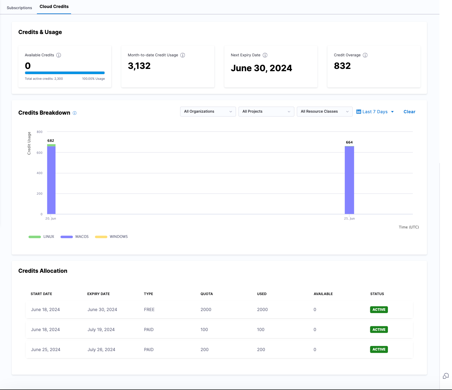 Credits Breakdown enables you to view your credit usage by organization, project, or resource class. You can also use the date filters to view by a Recommended range, Relative dates, Calendar months, or a selected custom range.