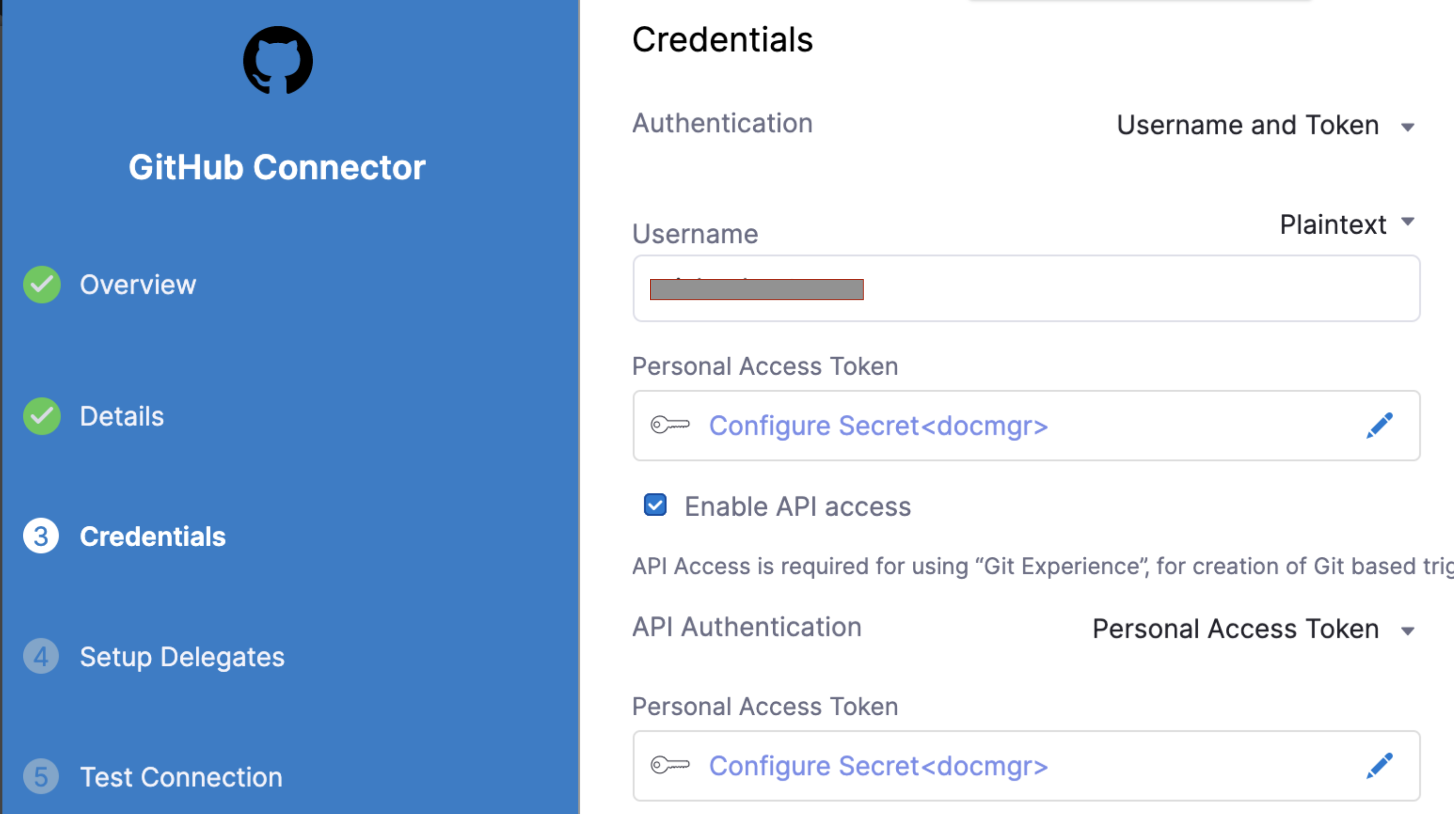 Connector must use the Enable API access option and Token The Connector must use the Enable API access option and Username and Token authentication. Harness requires a token for API access. Generate the token in your account on the Git provider and add it to Harness as a Secret. Next, use the token in the credentials for the Git Connector.
