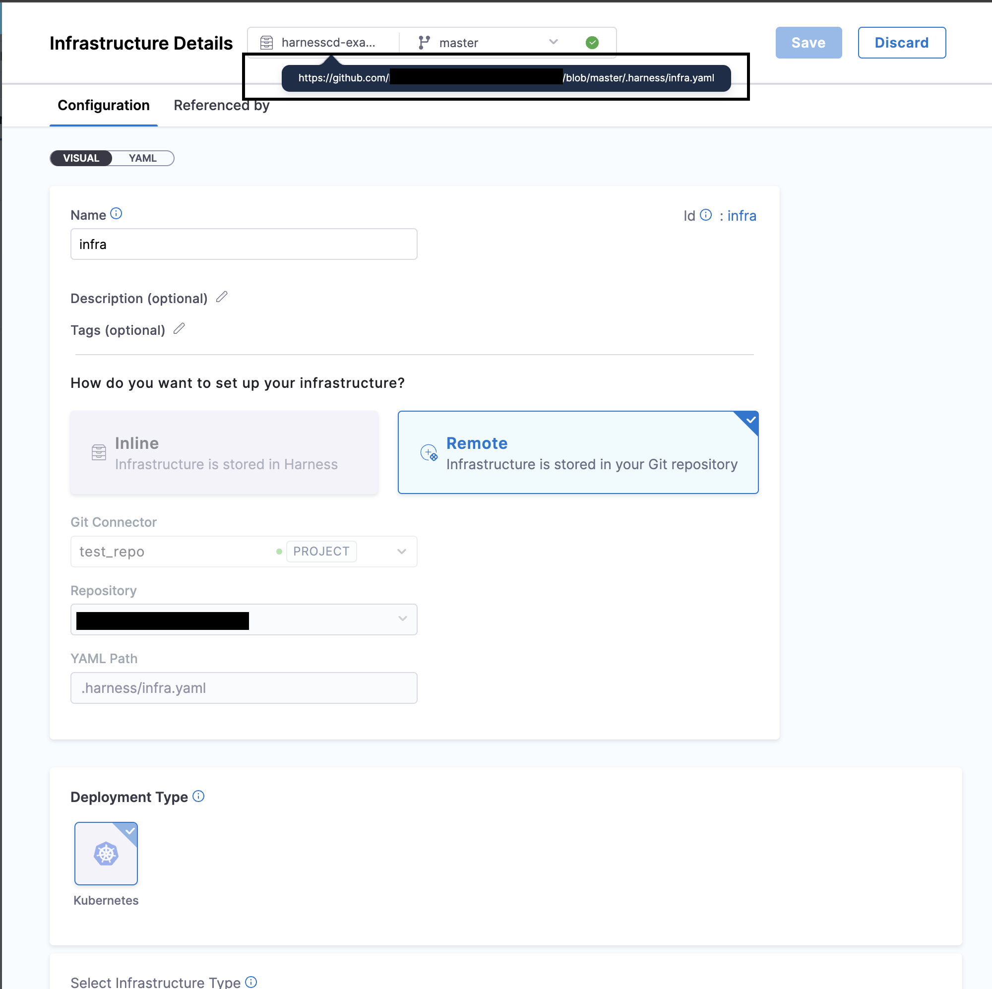 Harness will automatically populate the connector, repository, branch, and YAML path. The auto-population of the connector, branch, and repository is based on the environment configuration, specifically extracted from the Git repository where you've stored your environment details. You can change the connector as well as the branch.