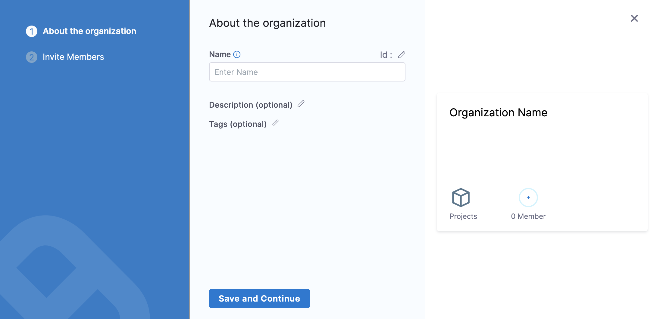 This topic describes how to create an org, invite Harness users to it as members, and create a project within the org.