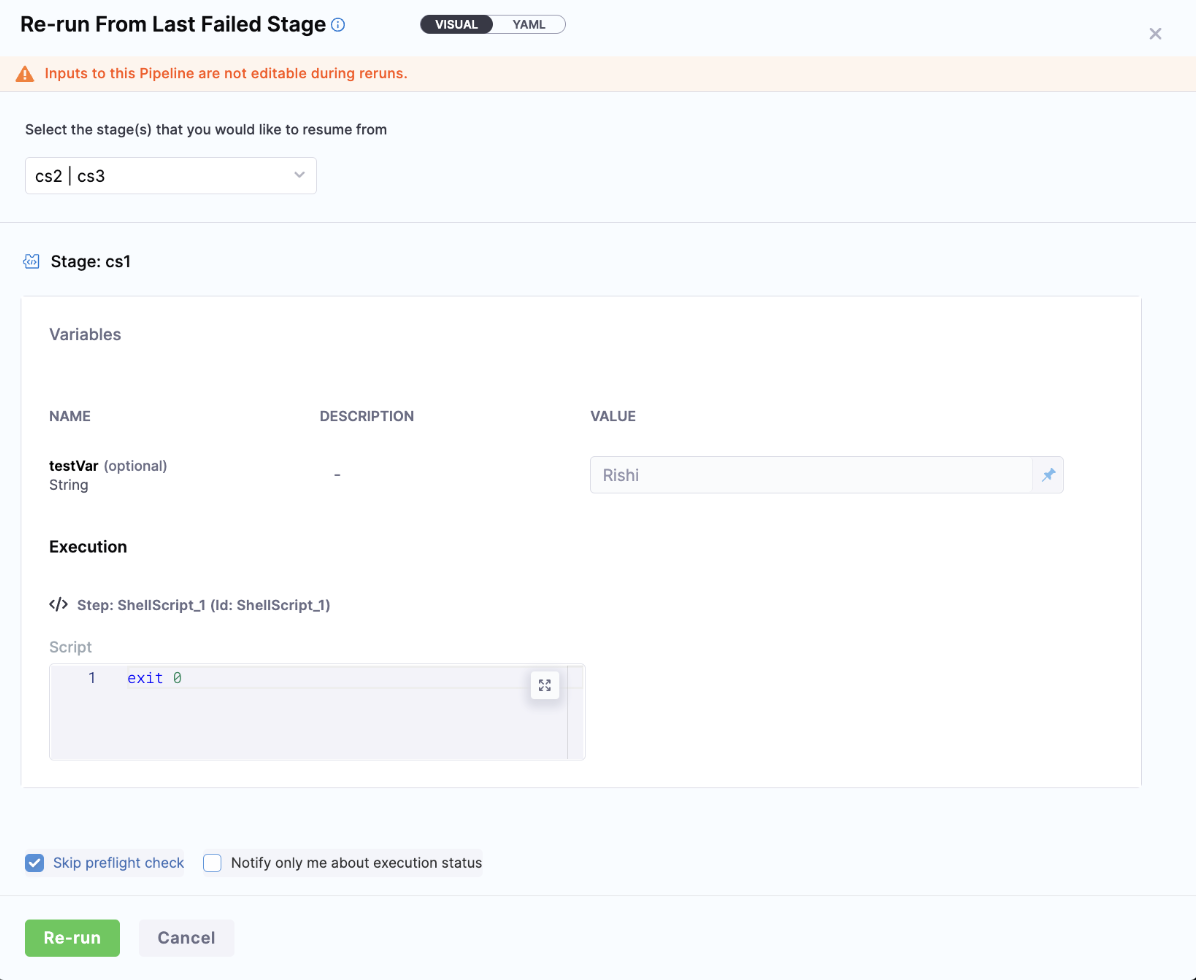 You will see a banner at top Inputs to this Pipeline are not editable during reruns., which states that you won't be able to change the inputs for this pipeline.