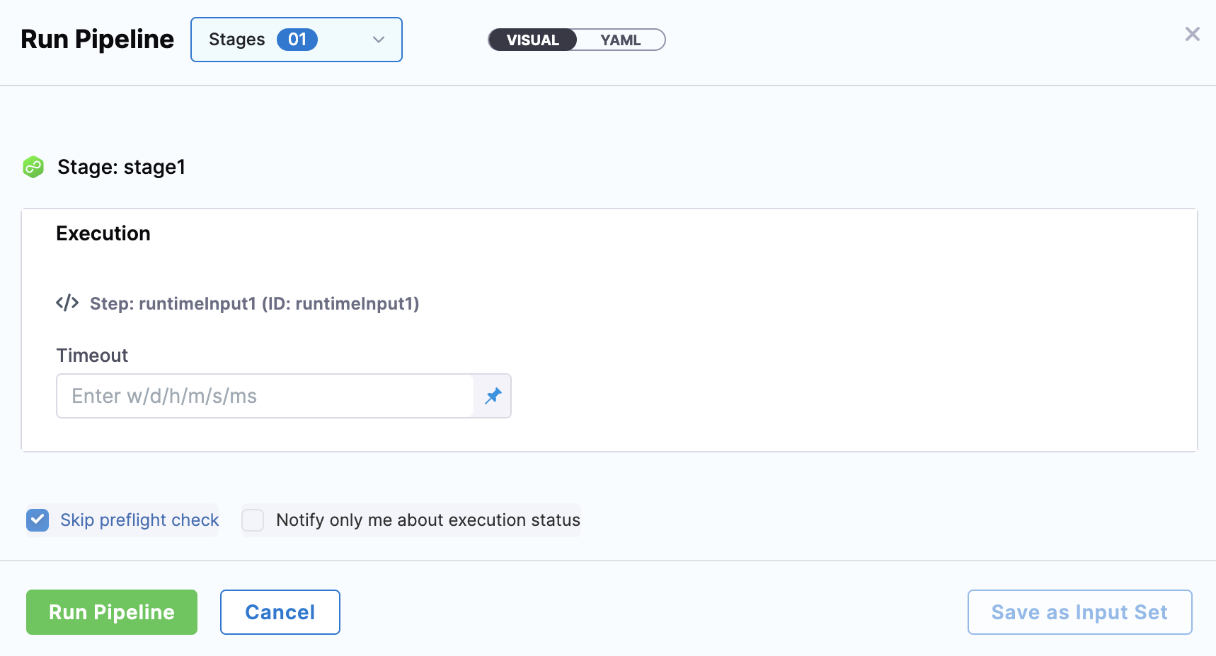 When viewing execution details for a previous pipeline run, you can select Re-run or Re-run Stage to rerun a single stage. If necessary, you're prompted to provide runtime inputs.