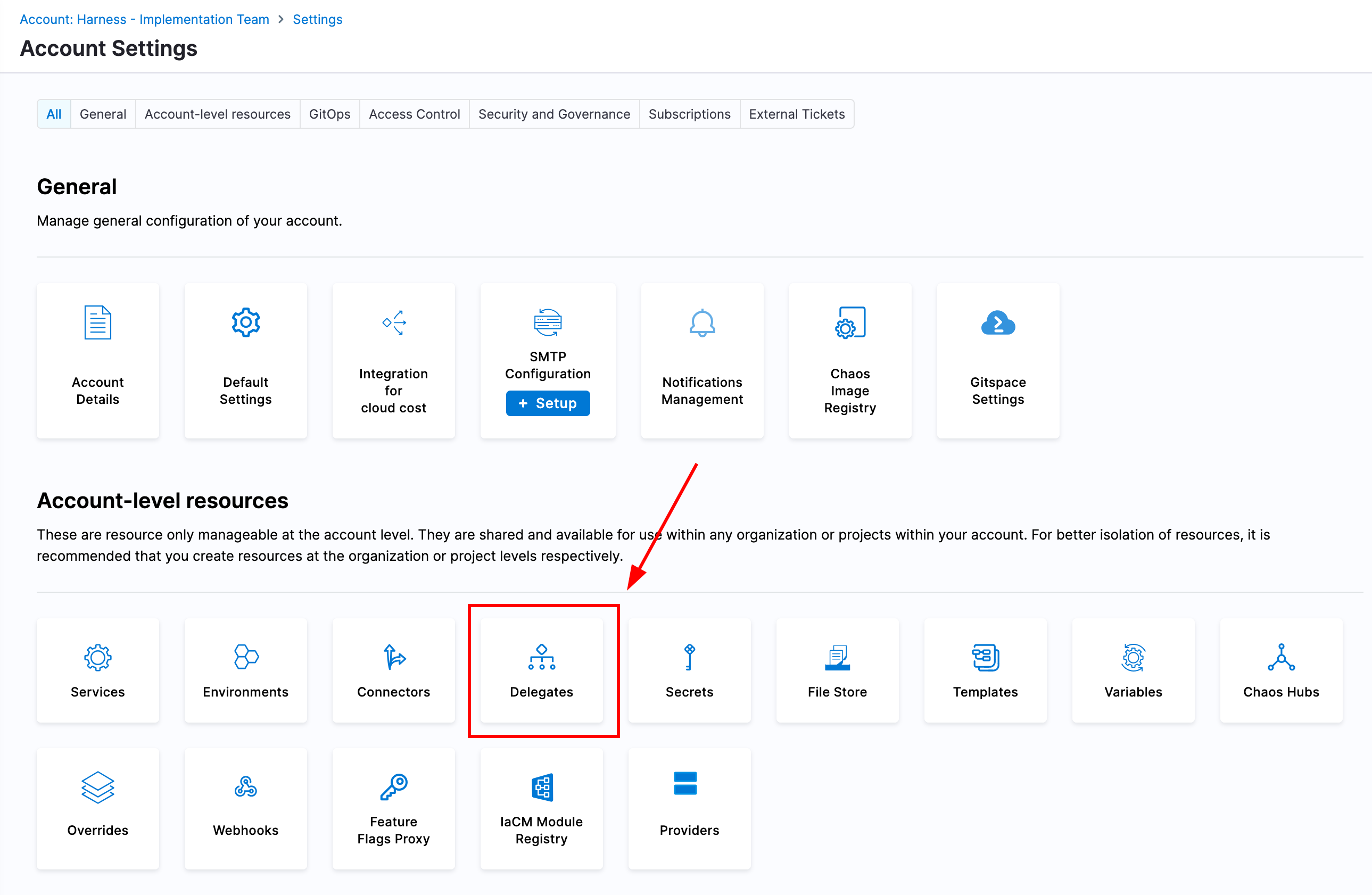 To deploy a new delegate, navigate to your Harness account settings and select the delegate tile under resources. You can then select New Delegate and your provisioning method; it is recommended to use Helm. From the New Delegate window, you can simply copy all of the configuration necessary to deploy a delegate for your Harness account in a target namespace.