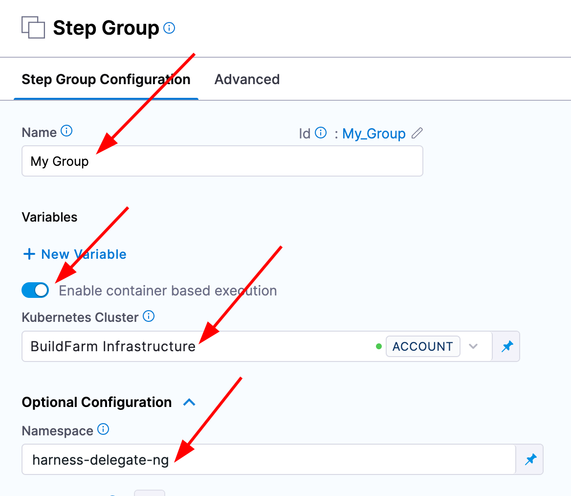 Next, select "Create a step" and "Create a step group". Give it a name and select the toggle for "Containerized step group". A new input should appear for a Kubernetes connector in which you can select the connector we created above. Next, expand the Advanced Settings option. In the namespace text box, type the namespace where you deployed the delegate. You can now click apply changes in the top right.