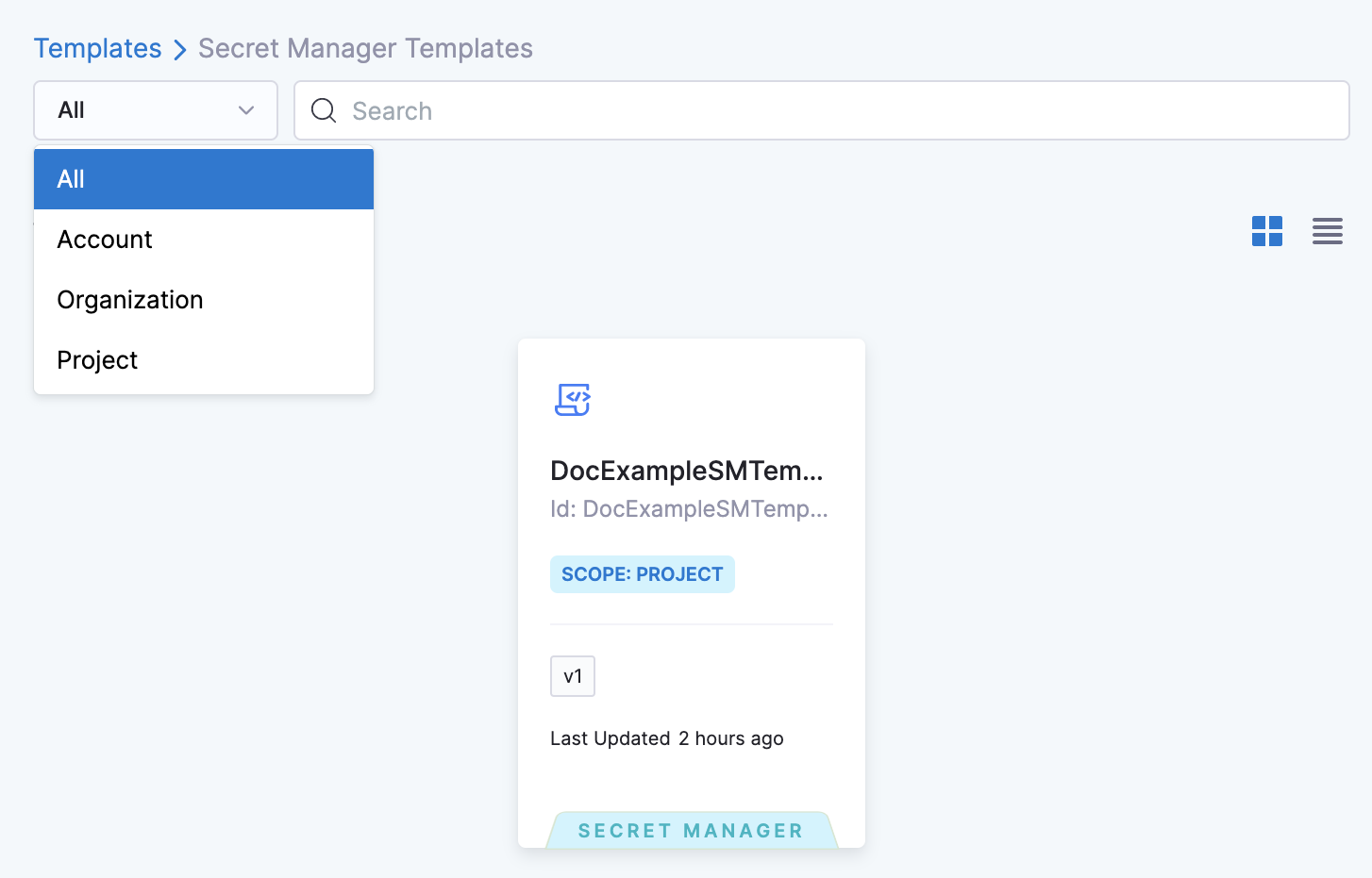 You can also search for a specific Secret Manager Template by entering its name in Search. Once you select the Secret Manager Template, the details are displayed in the Template Studio.