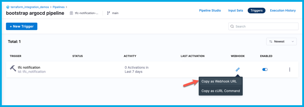7. On the list of triggers, select the icon in the Webhook column, and then select Copy as Webhook URL. This value is referred to as $TRIGGER_WEBHOOK_URL in the rest of this tutorial.