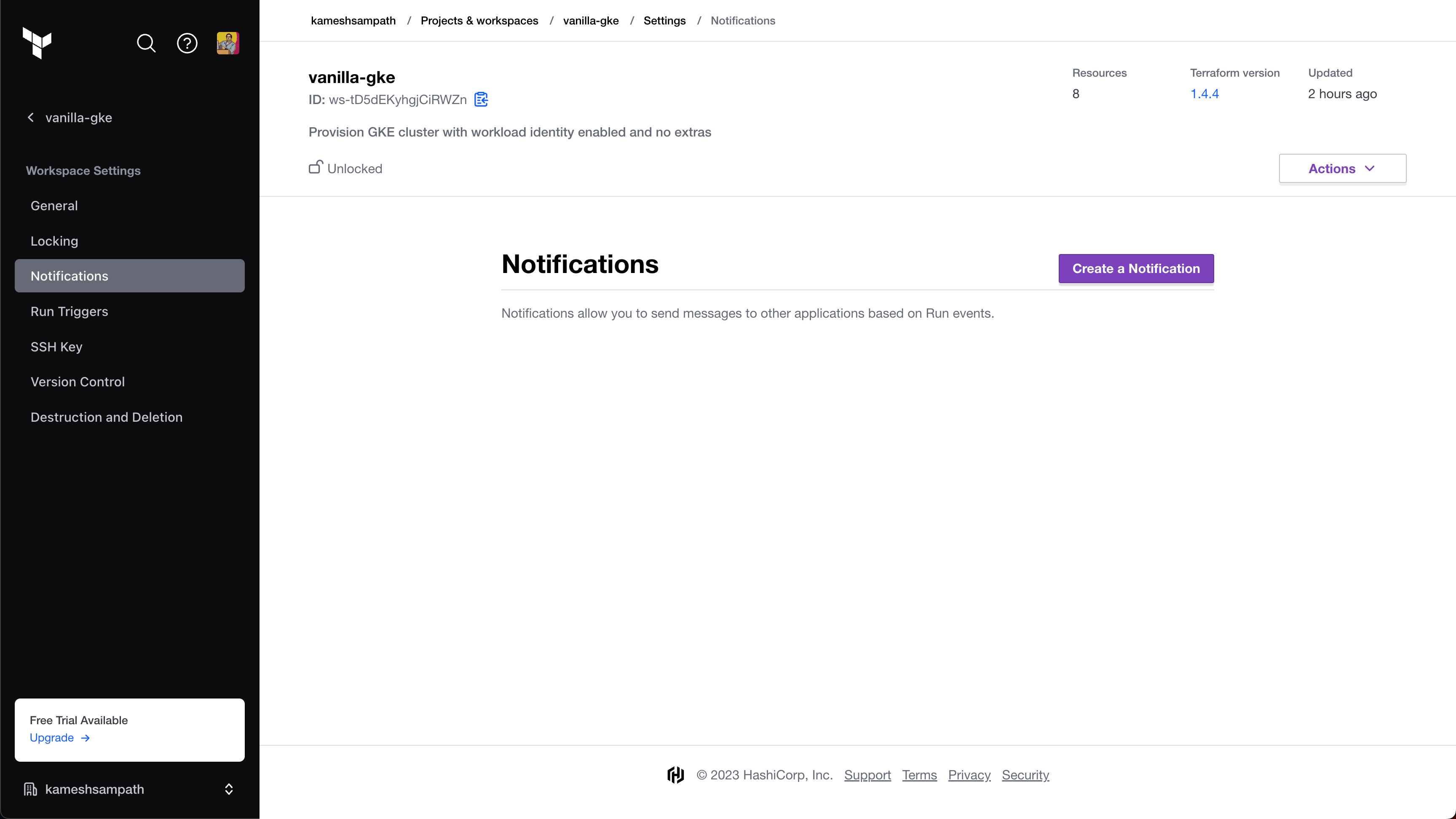 8. In your Terraform Cloud workspace, go to the notification settings, and select Create a Notification.