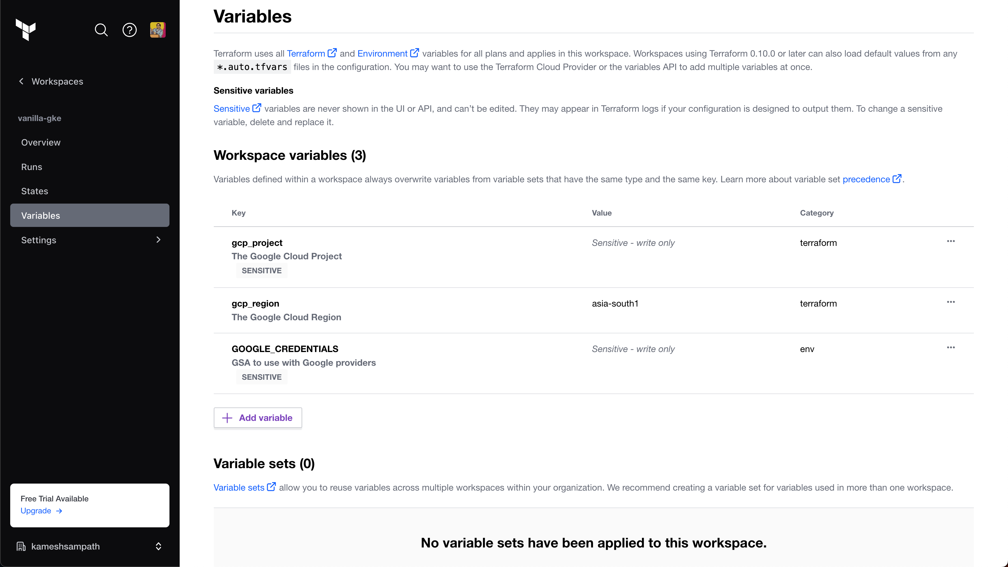 1. In your Terraform Cloud account, create a workspace called vanilla-gke.