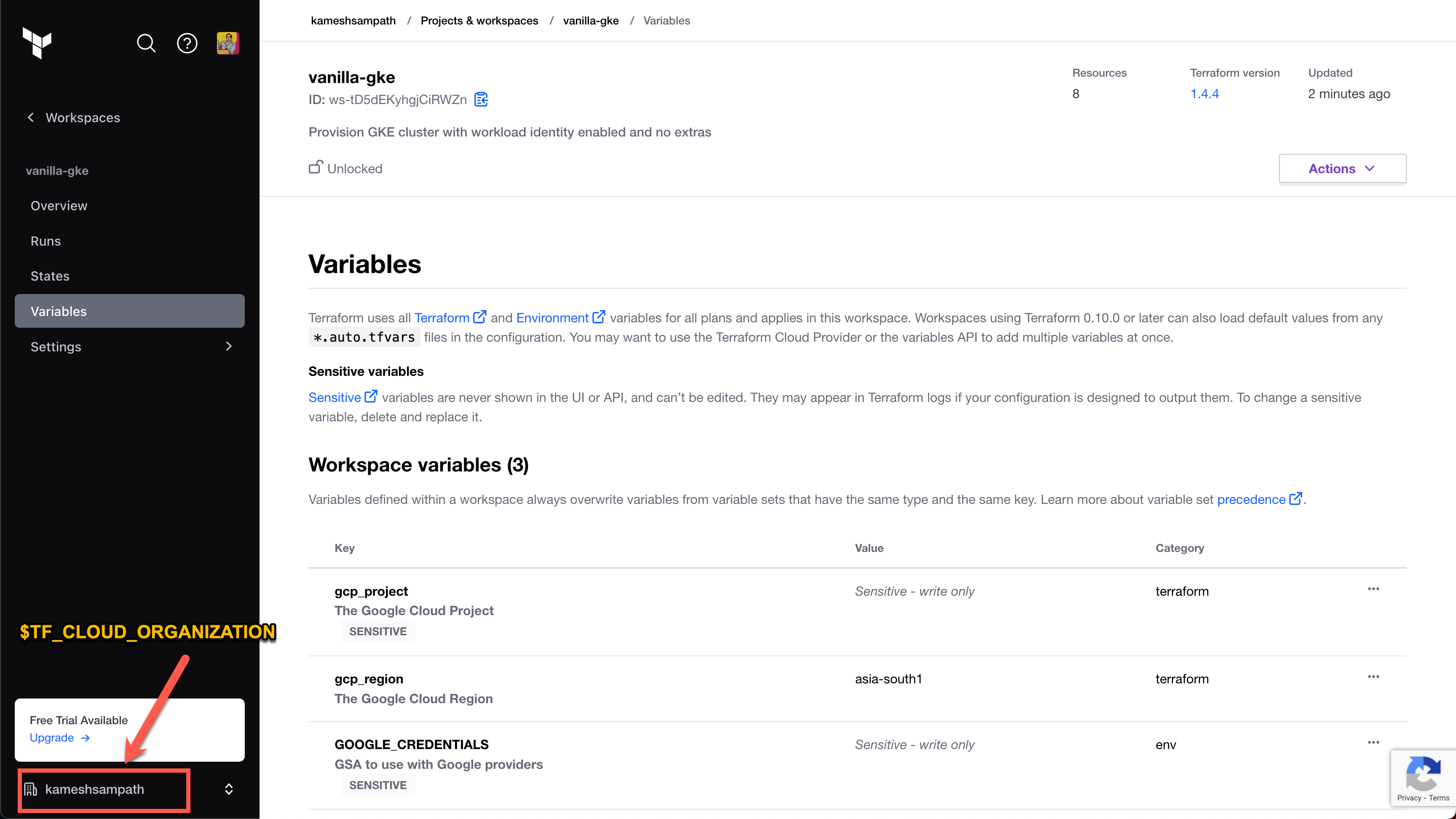 4. Create a variable called $TF_WORKSPACE and set the value to the name of your Terraform Cloud organization.