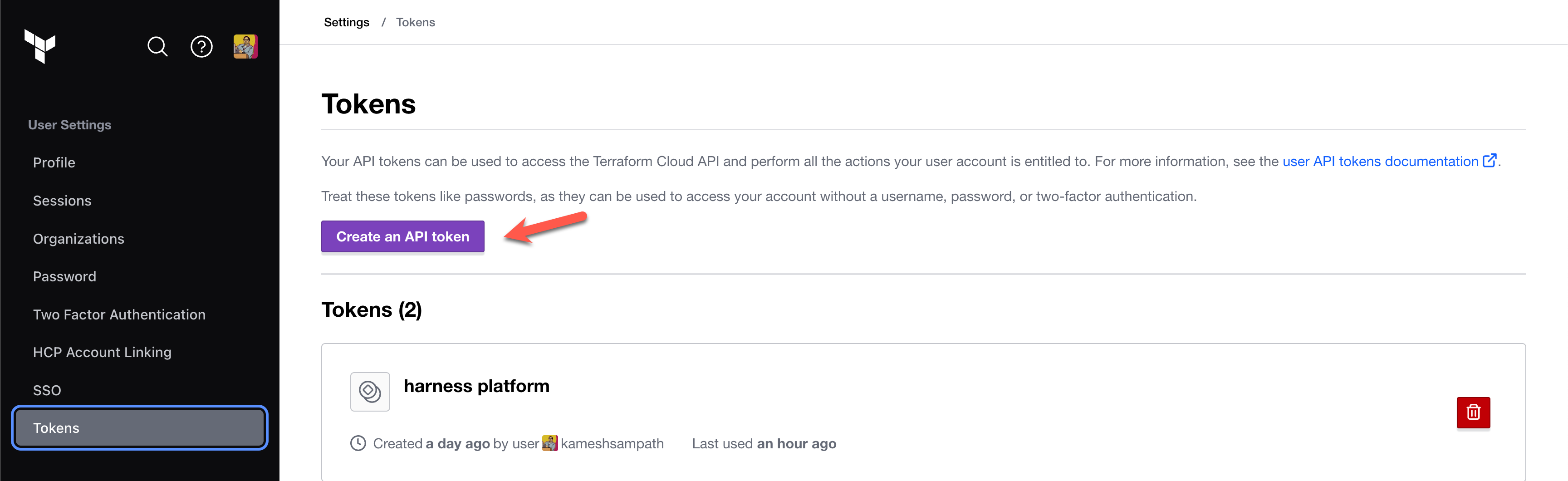 5. In your Terraform Cloud user settings, Create an API token. This token is used to pull outputs from Terraform runs.