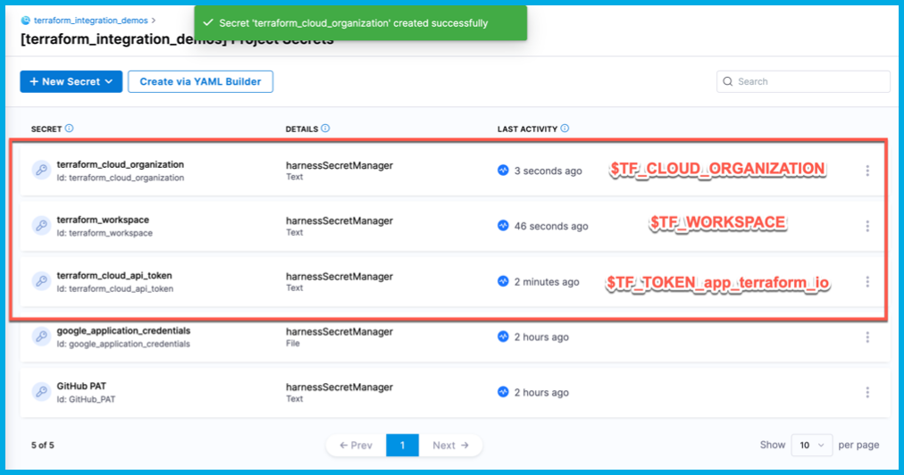 3. To populate these values, add Harness text secrets for terraform_cloud_api_token, terraform_workspace and terraform_cloud_organization.