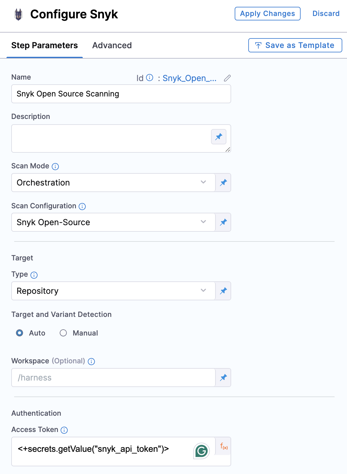 - You can now configure the Snyk step to perform the Snyk Open Source scan.