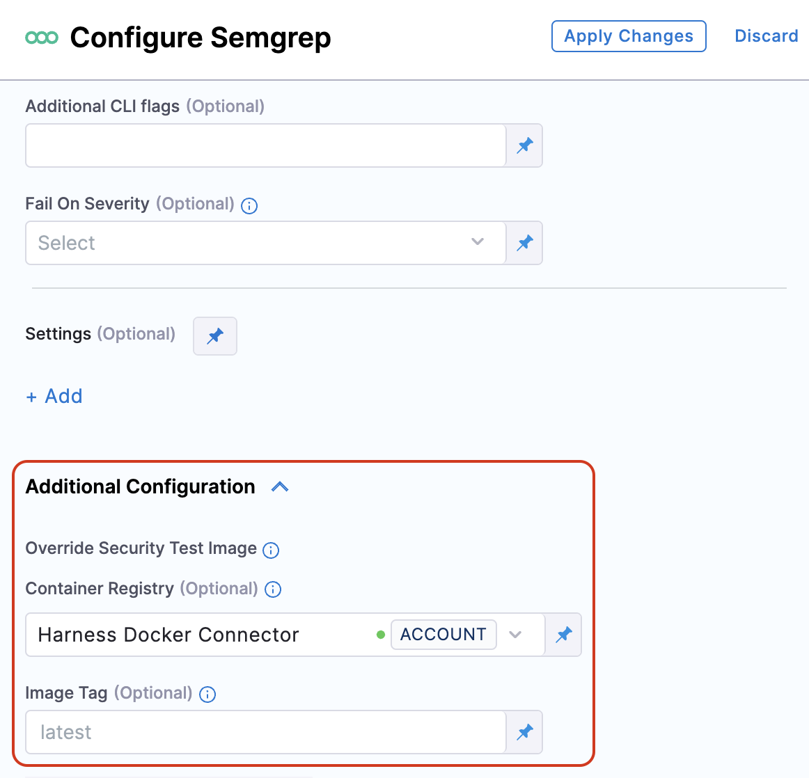 To override the scanner image in a Custom Scan step, add the following settings in the Additional Configuration section of the Custom Scan step: