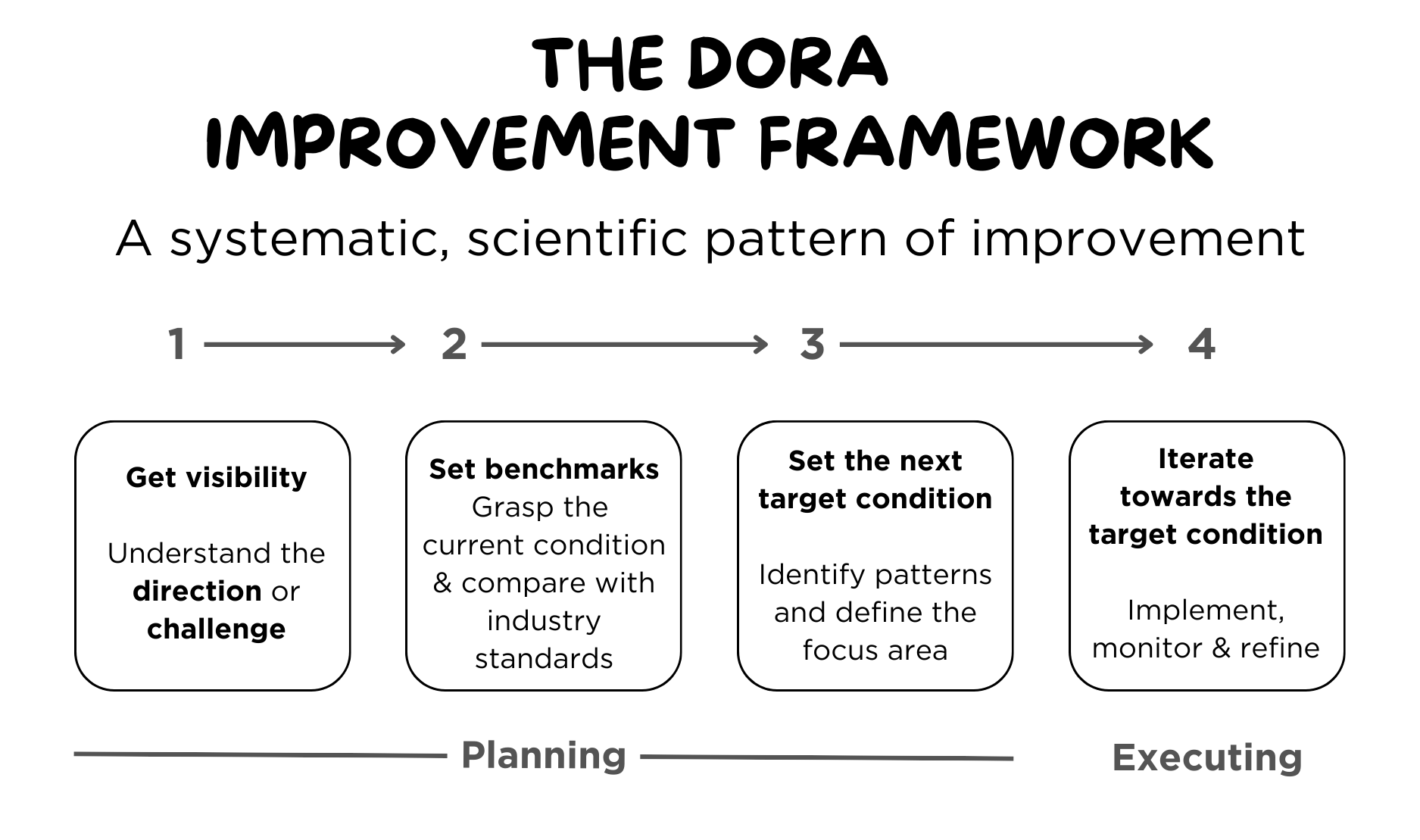 Focus on one metric at a time within a specific metric category (e.g., lead time for changes under efficiency). Avoid getting overwhelmed by tackling too many metrics at once. The goal is to take a targeted approach—improve one area before moving to the next.